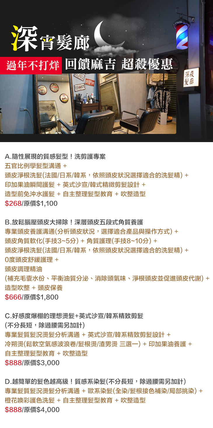 下班後總是找不到一間好的髮廊可以洗頭、剪頭髮還有做染燙呢?別擔心,現在有【深宵髮廊】來為你服務!復古的裝潢配上工業風,乾淨特別的髮廊,讓你在下班後可以來個放鬆的剪髮之旅,所有服務,將由專業的髮型設計師來幫你,將髮型的細節處理的很細緻,只為給你一個完美、亮麗的好髮型,讓你可以煥然一新!這樣一間時間與CP值都符合你要求的髮廊,怎麼能不約起來呢!