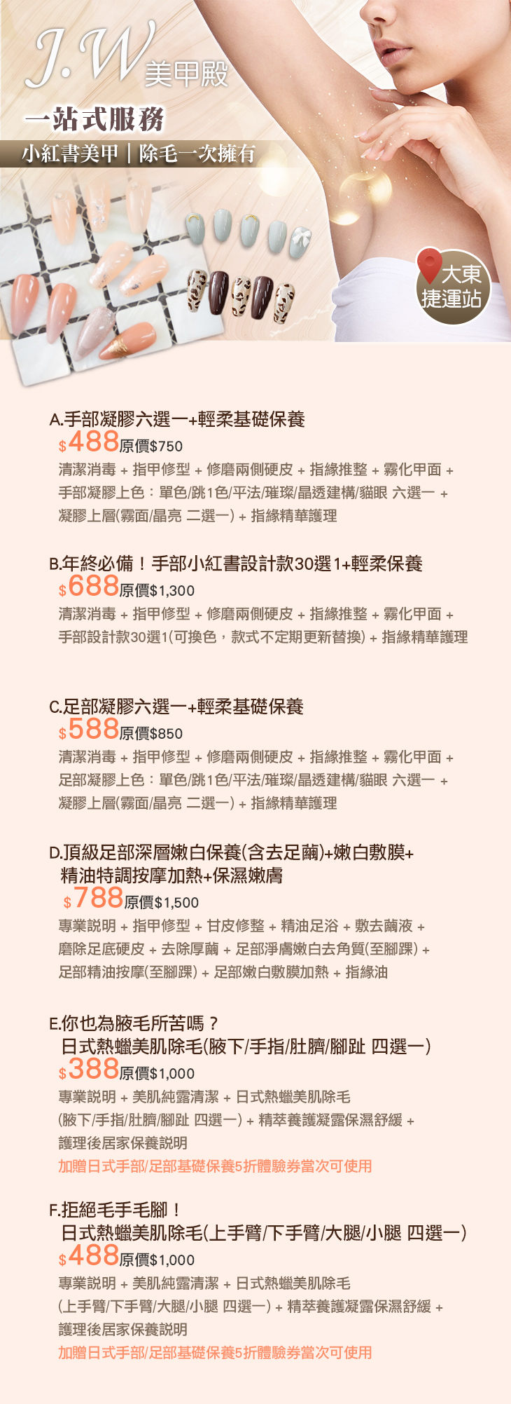A.手部凝膠六選一+輕柔基礎保養 / B.年終必備!手部小紅書設計款30選1+輕柔保養 / C.足部凝膠六選一+輕柔基礎保養 / D.頂級足部深層嫩白保養(含去足繭)+嫩白敷膜+精油特調按摩加熱+保濕嫩膚 / E.你也為腋毛所苦嗎?日式熱蠟美肌除毛(腋下/手指/肚臍/腳趾 四選一) / F.拒絕毛手毛腳!日式熱蠟美肌除毛(上手臂/下手臂/大腿/小腿 四選一)