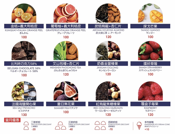 左:金桔+義大利桔皮(上)炭焙烏龍杏仁(下)右:探戈芒果(上)覆盆子莓果(下)