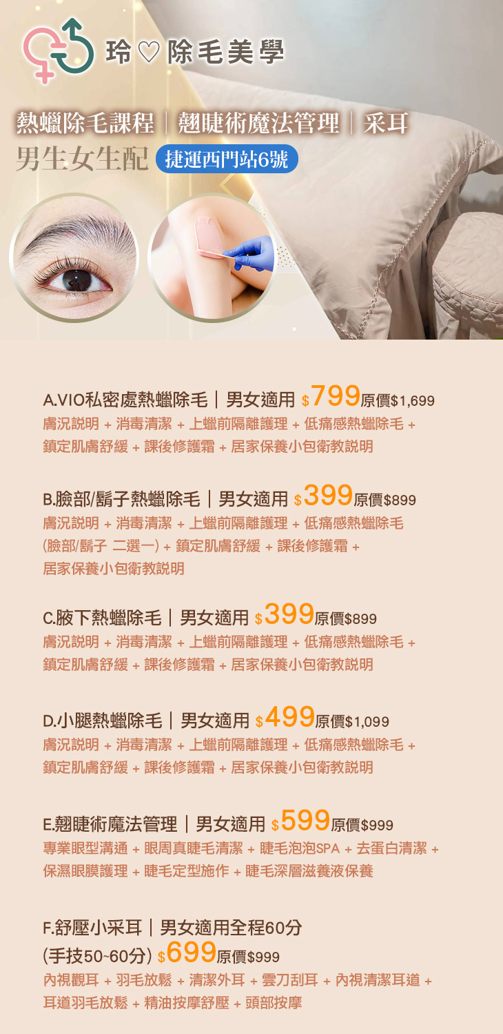 A.VIO私密處熱蠟除毛|男女適用 / B.臉部/鬍子熱蠟除毛|男女適用 / C.腋下熱蠟除毛|男女適用 / D.小腿熱蠟除毛|男女適用 / E.翹睫術魔法管理|男女適用 / F.舒壓小采耳|男女適用全程60分(手技50~60分)