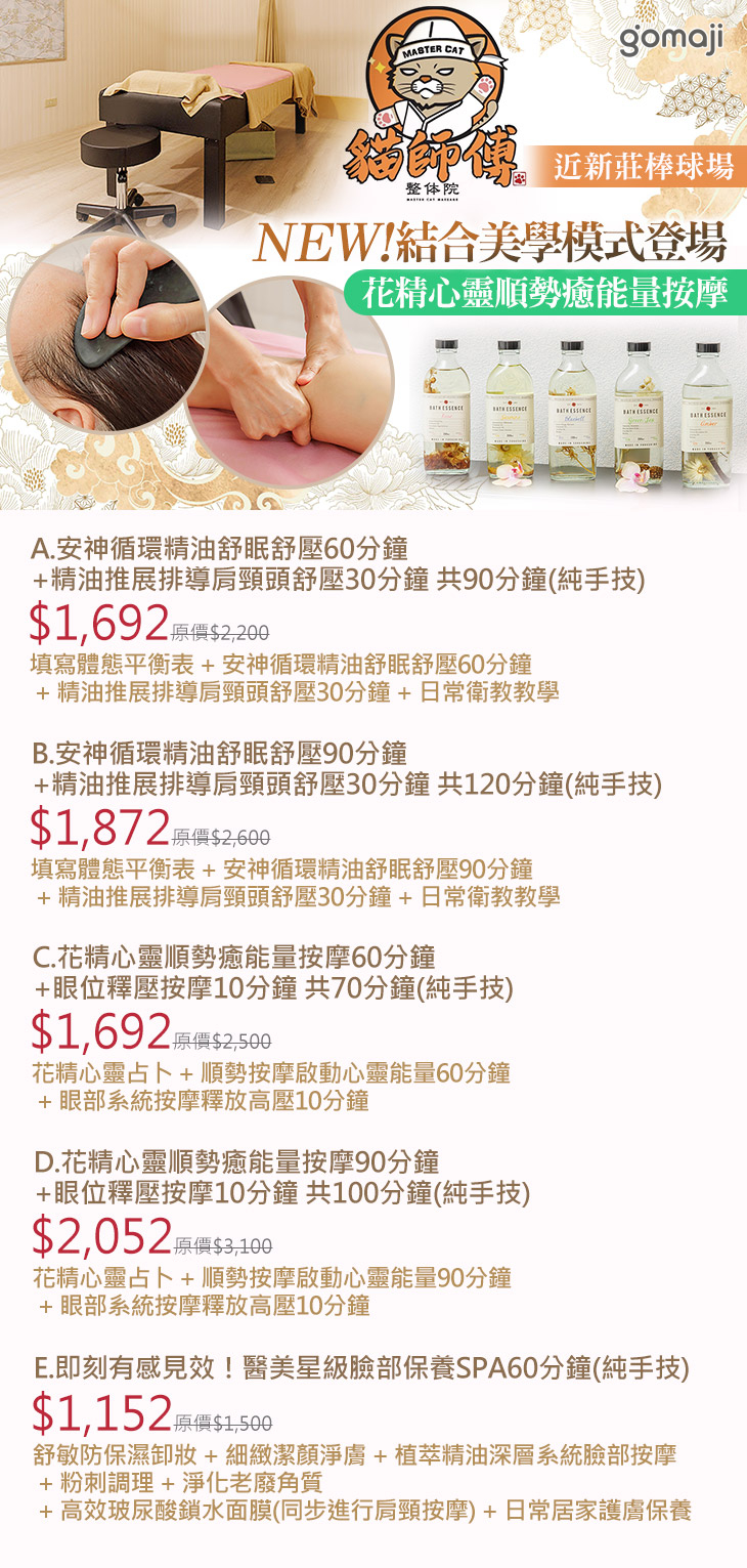 C.花精心靈順勢癒能量按摩60分鐘+眼位釋壓按摩10分鐘 共70分鐘(純手技)