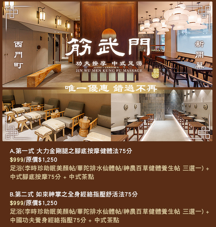 延續武昌館的精隨,秉持「獨門功夫按摩」、「真材實料足湯草藥」,以及舒適到讓人秒睡的環境空間,筋武門要給大家全新的按摩體驗啦!筋武門的按摩是傳承中國功夫,研發出自己的一套獨特的[功夫按摩],透過武術的指、掌、拳等的武術招式、巧妙應用在按摩手法上,讓你感受全新舒服的按摩體驗,按摩完就如打通你全身的任督二脈一般,讓你恢復滿滿的元氣。