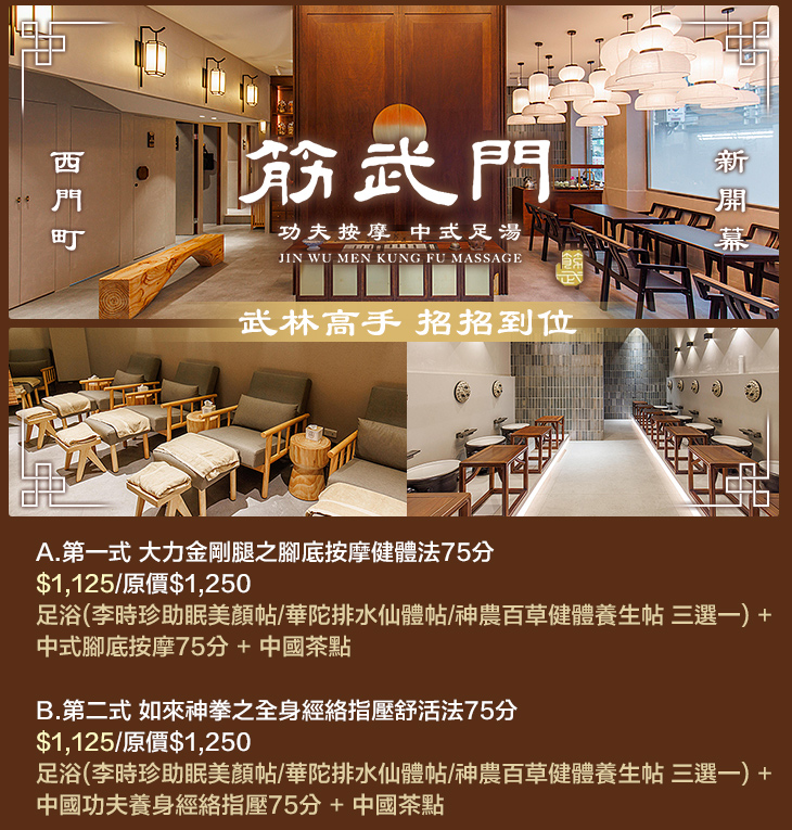 延續武昌館的精隨,秉持「獨門功夫按摩」、「真材實料足湯草藥」,以及舒適到讓人秒睡的環境空間,筋武門要給大家全新的按摩體驗啦!筋武門的按摩是傳承中國功夫,研發出自己的一套獨特的[功夫按摩],透過武術的指、掌、拳等的武術招式、巧妙應用在按摩手法上,讓你感受全新舒服的按摩體驗,按摩完就如打通你全身的任督二脈一般,讓你恢復滿滿的元氣。