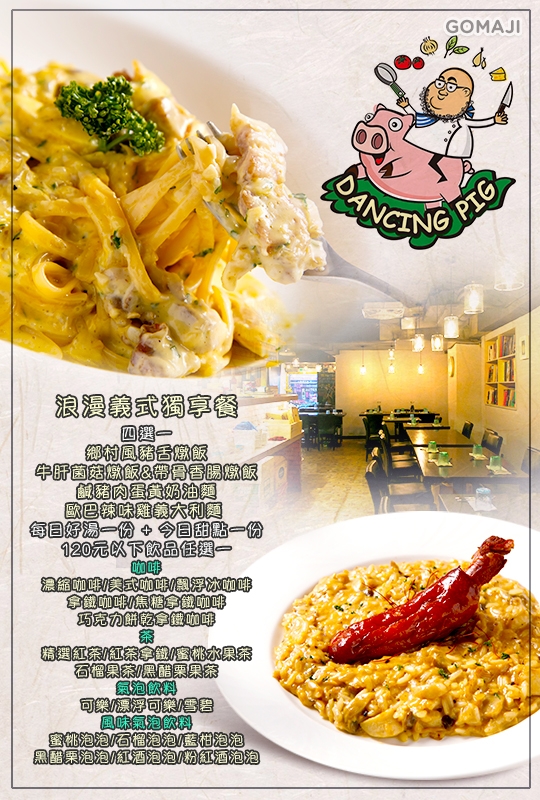 善於利用台灣在地食材呈現義式料理精髓的主廚Jason,繼大肚皮義式餐坊後再推出「豬跳舞」創意西式料理,以持續推廣在地好食材的心意,讓消費者可以隨季節變化吃到最新鮮的物產,並將產季價格和低食物里程的成本概念反應在售價上,讓「豬跳舞」成為一個隨時都能和三五好友相約在此盡情分享美食的好地方。