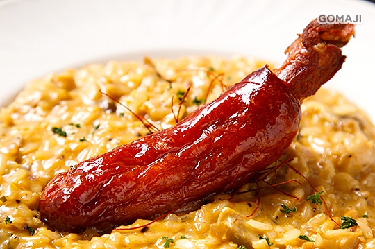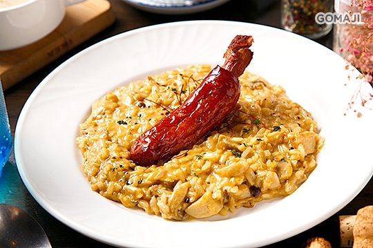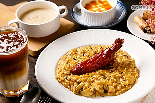 綿密細緻的燉飯飽吸醬汁精華,鬆軟醇香伴隨著溫潤美味,佐以紮實鹹香的帶骨香腸一同享用,吃過就愛上!
