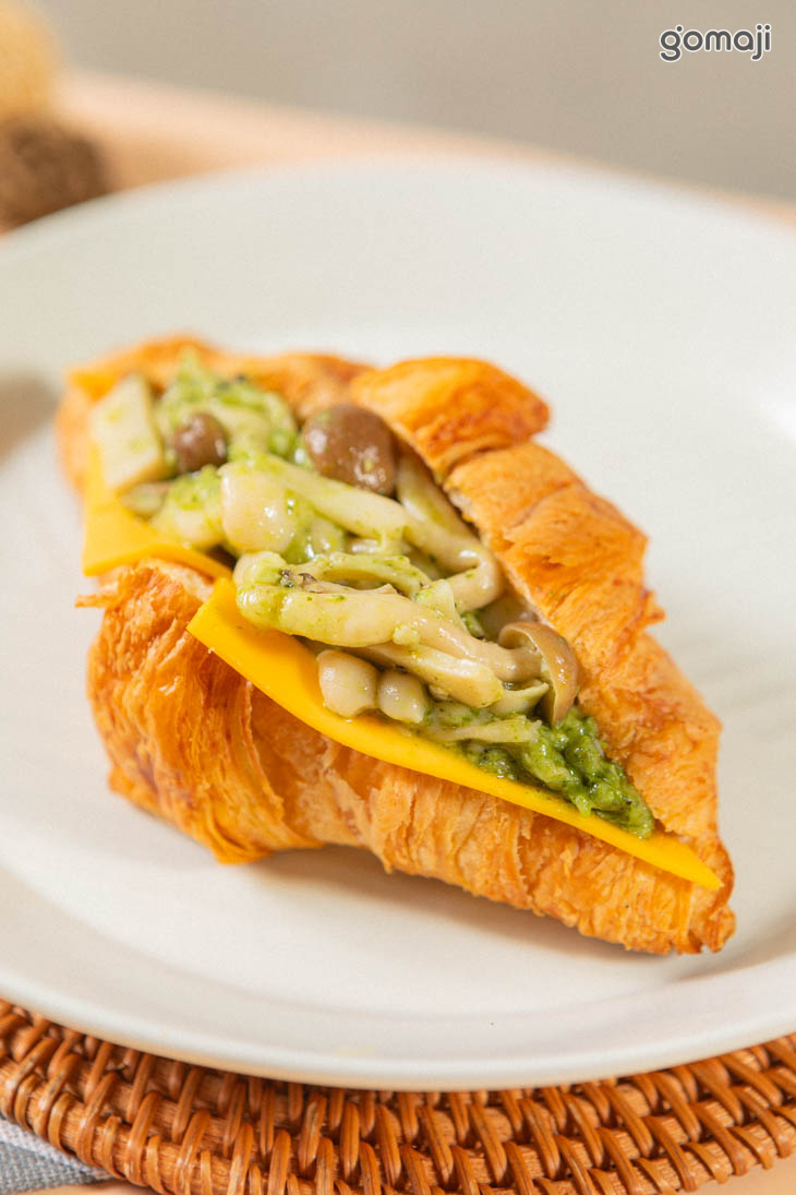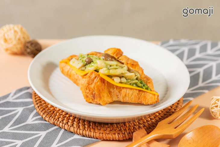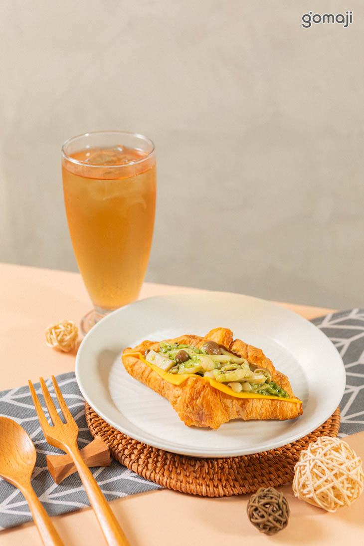 結合了新鮮的田園野菇與清新爽口的青醬,為您呈現出一道令人垂涎的美味餐點!每一口都充滿著深厚的野菇風味,酥脆的可頌外皮與濕潤的內餡完美搭配,帶來多元的層次感,香氣撲鼻,讓人不禁食指大動~這款青醬田園野菇可頌不僅是視覺上的享受,更是味蕾的盛宴,是一道色香味俱全的餐點。