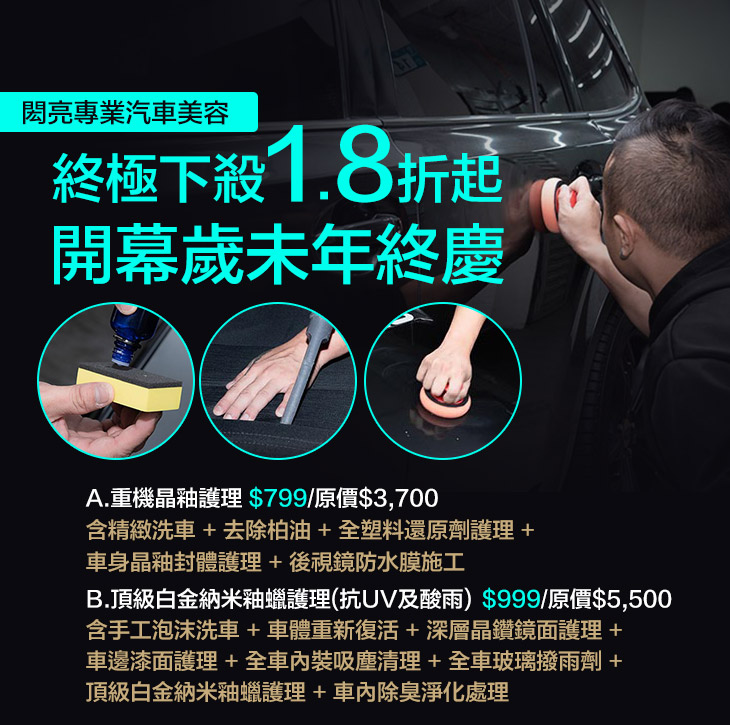〈含手工泡沫洗車 + 車體重新復活 + 深層晶鑽鏡面護理 + 車邊漆面護理 + 全車內裝吸塵清理 + 全車玻璃撥雨劑 + 頂級白金納米釉蠟護理 + 車內除臭淨化處理〉