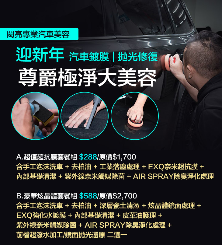 〈含手工泡沫洗車 + 去柏油 + 深層瓷土清潔 + 炫晶體鏡面處理 + EXQ強化水鍍膜 + 內部基礎清潔 + 皮革油護理 + 紫外線奈米觸媒除菌 + Air Spray除臭淨化處理 + 前檔超潑水加工/鏡面拋光還原 二選一〉