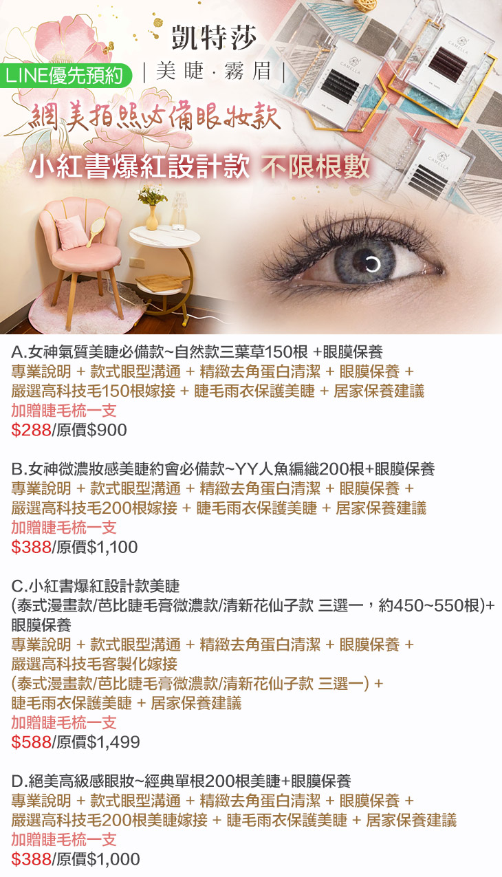 A.女神氣質美睫必備款~自然款三葉草150根 +眼膜保養 / B.女神微濃妝感美睫約會必備款~YY人魚編織200根+眼膜保養 / C.小紅書爆紅設計款美睫(泰式漫畫款/芭比睫毛膏微濃款/清新花仙子款 三選一,約450~550根)+眼膜保養 / D.絕美高級感眼妝~經典單根200根美睫+眼膜保養