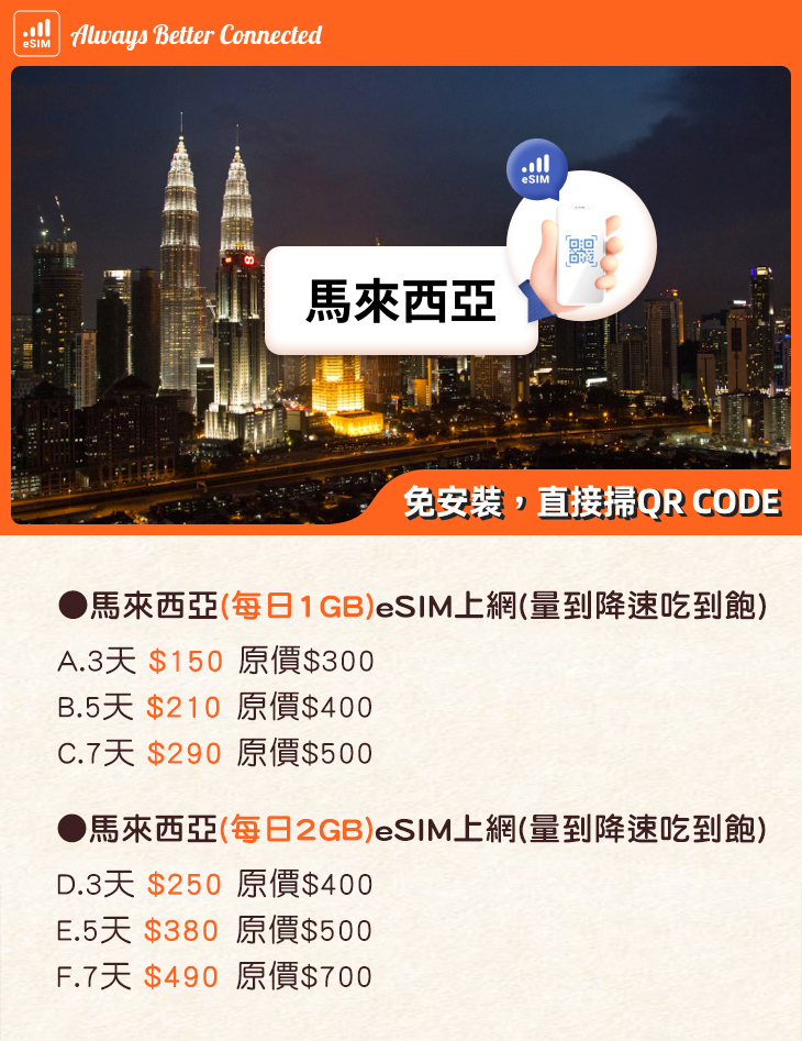 【馬來西亞eSIM上網】每日1GB/2GB(3/5/7天)高速上網(免換卡)