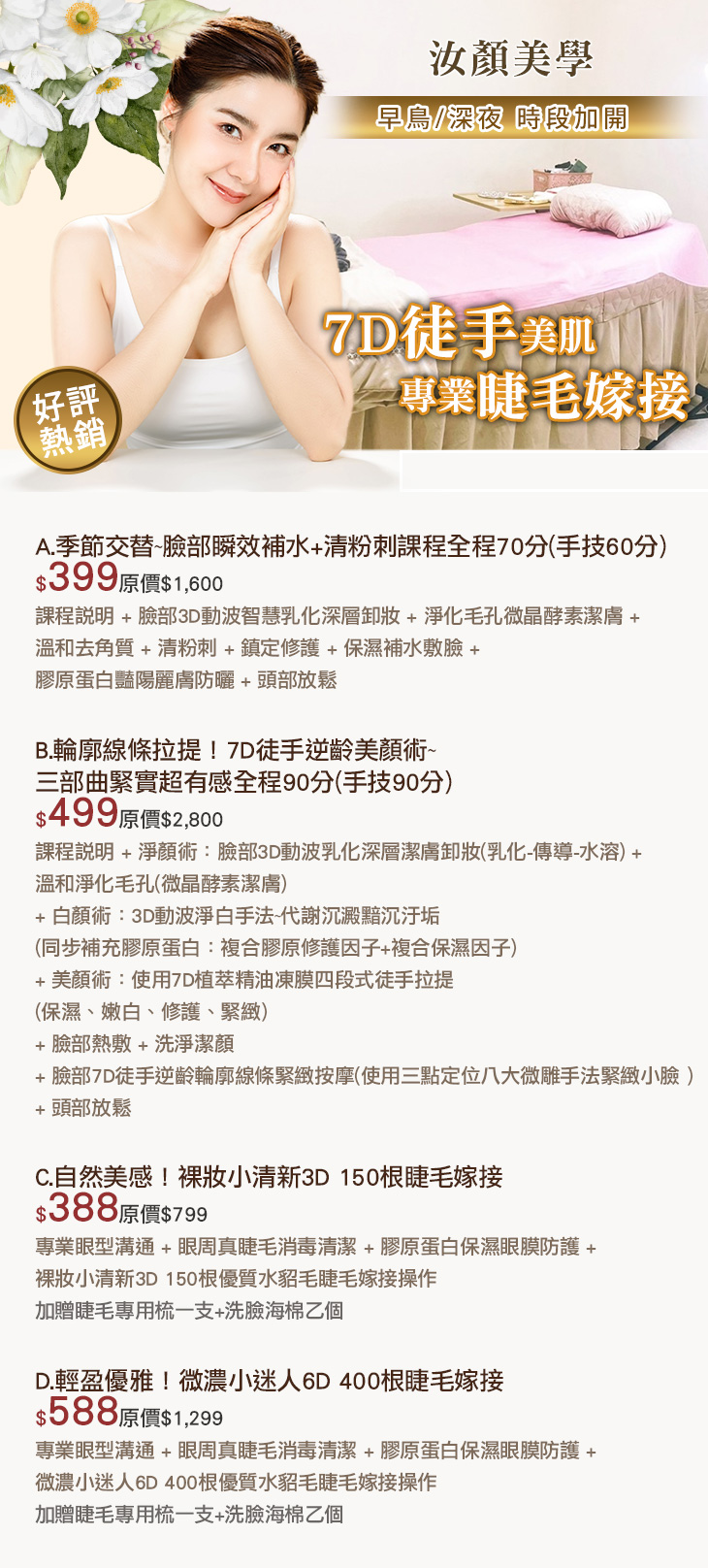 A.季節交替~臉部瞬效補水+清粉刺課程全程70分(手技60分) / B.輪廓線條拉提!7D徒手逆齡美顏術~三部曲緊實超有感全程90分(手技90分) / C.自然美感!裸妝小清新3D 150根睫毛嫁接 / D.輕盈優雅!微濃小迷人6D 400根睫毛嫁接