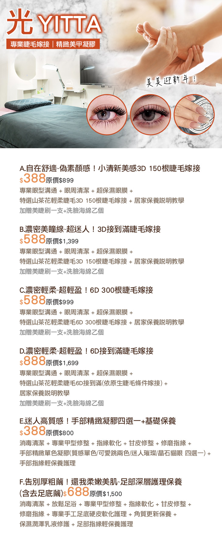A.自在舒適~偽素顏感!小清新美感3D 150根睫毛嫁接 / B.濃密美瞳線~超迷人!3D接到滿睫毛嫁接 / C.濃密輕柔~超輕盈!6D 300根睫毛嫁接 / D.濃密輕柔~超輕盈!6D接到滿睫毛嫁接 / E.迷人高質感!手部精緻凝膠四選一+基礎保養 / F.告別厚粗繭!還我柔嫩美肌~足部深層護理保養(含去足底繭)