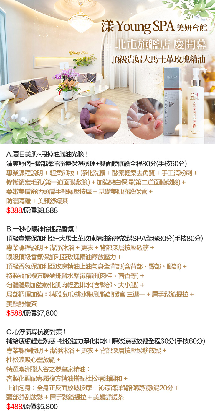 A.夏日美肌~甩掉油膩油光臉!清爽舒適~臉部海洋淨痘保濕護理+雙面膜修護全程80分(手技60分) / B.一秒心曠神怡極品香氛!頂級貴婦保加利亞-大馬士革玫瑰精油舒壓放鬆SPA全程80分(手技80分) / C.心浮氣躁抗衡對策!補給疲憊趕走熱感~杜松強力淨化排水+瞬效涼感放鬆全程60分(手技60分)
