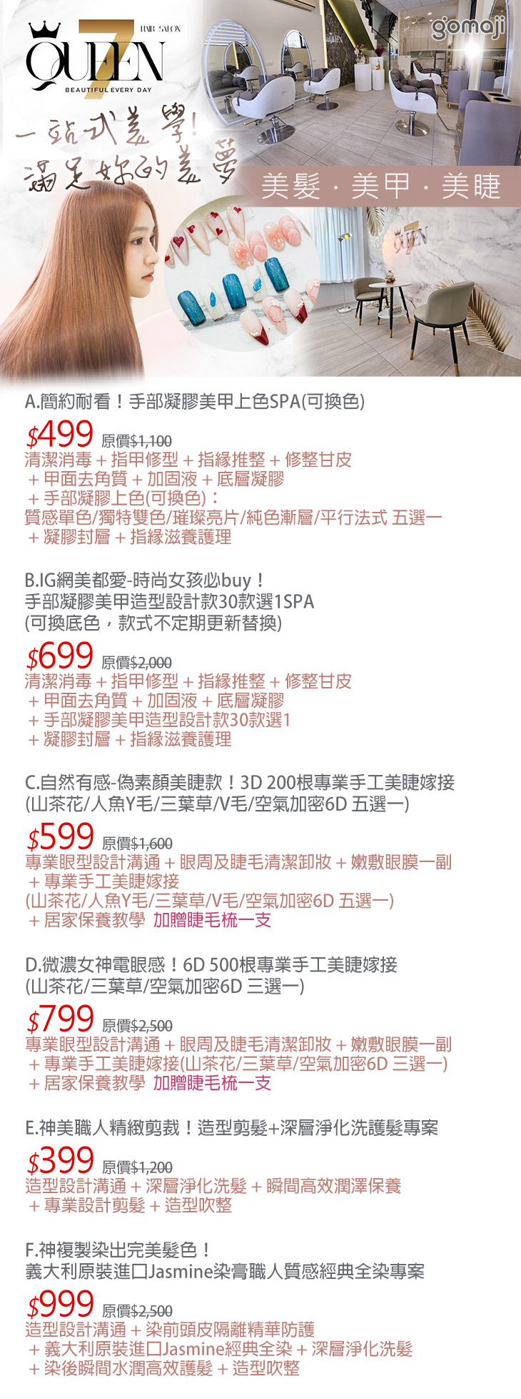 A.手部凝膠美甲上色SPA(可換色) / B.IG網美都愛-手部凝膠美甲造型設計款30款選1SPA(可換底色,款式不定期更新替換) / C.3D 200根專業手工美睫嫁接(山茶花/人魚Y毛/三葉草/V毛/空氣加密6D 五選一) / D.6D 500根專業手工美睫嫁接(山茶花/三葉草/空氣加密6D 三選一) / E.造型剪髮+深層淨化洗護髮專案 / F.義大利原裝進口Jasmine染膏職人質感