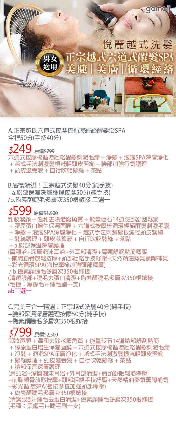 A.正宗越氏六道式按摩梳循環經絡醒髮浴SPA全程50分(手技40分) / B.客製精選!正宗越式洗髮40分(純手技)+a.臉部保濕深層護理按摩50分(純手技)/b.偽素顏睫毛多層次350根嫁接 二選一 / C.完美三合一精選!正宗越式洗髮40分(純手技)+臉部保濕深層護理按摩50分(純手技)+偽素顏睫毛多層次350根嫁接