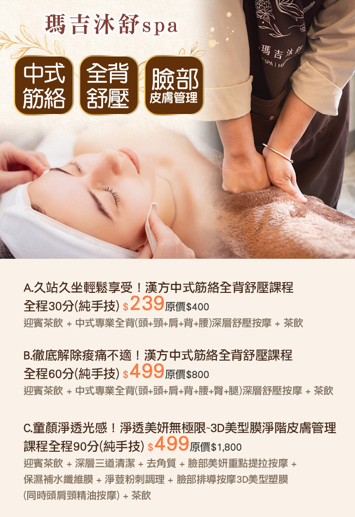 A.久站久坐輕鬆享受!漢方中式筋絡全背舒壓課程全程30分(純手技) / B.徹底解除痠痛不適!漢方中式筋絡全背舒壓課程全程60分(純手技) / C.童顏淨透光感!淨透美妍無極限~3D美型膜淨階皮膚管理課程全程90分(純手技)
