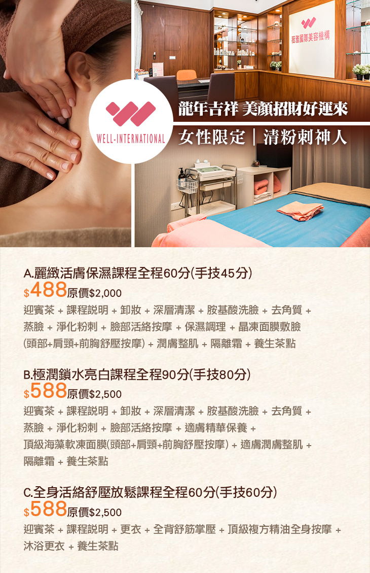A.麗緻活膚保濕課程全程60分(手技45分) / B.極潤鎖水亮白課程全程90分(手技80分) / C.全身活絡舒壓放鬆課程全程60分(手技60分)
