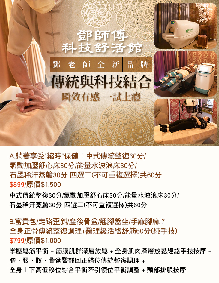 A.躺著享受"縮時"保健!中式傳統整復30分/氣動加壓舒心床30分/能量水波浪床30分/石墨稀汗蒸艙30分 四選二(不可重複選擇)共60分 / B.富貴包/走路歪斜/產後骨盆/翹腳盤坐/手麻腳麻?全身正骨傳統整復調理+醫理級活絡舒筋60分(純手技)