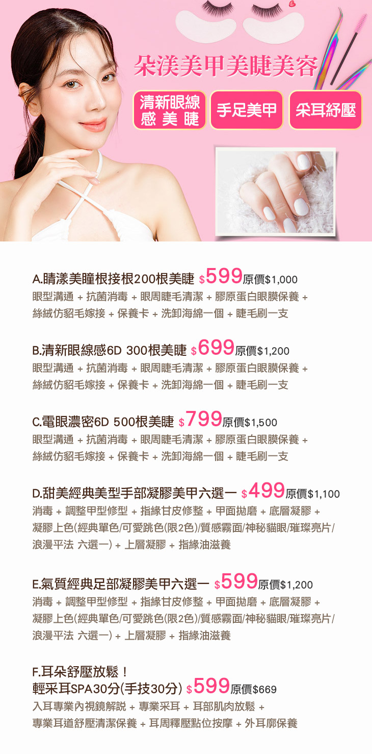 A.睛漾美瞳根接根200根美睫 / B.清新眼線感6D 300根美睫 / C.電眼濃密6D 500根美睫 / D.甜美經典美型手部凝膠美甲六選一 / E.氣質經典足部凝膠美甲六選一 / F.耳朵舒壓放鬆!輕采耳SPA30分(手技30分)