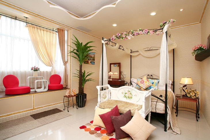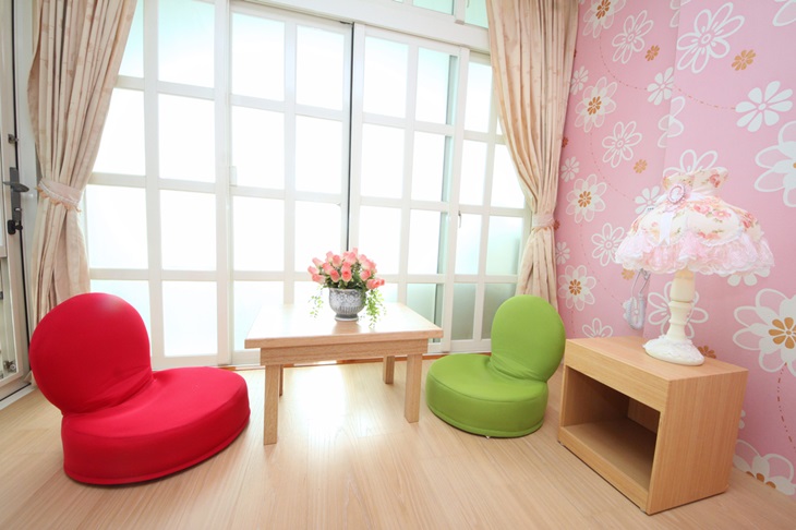 帶著潔白小花的粉紅壁紙就像是跳著舞的小公主,紅綠兩色的小沙發活潑又可愛!