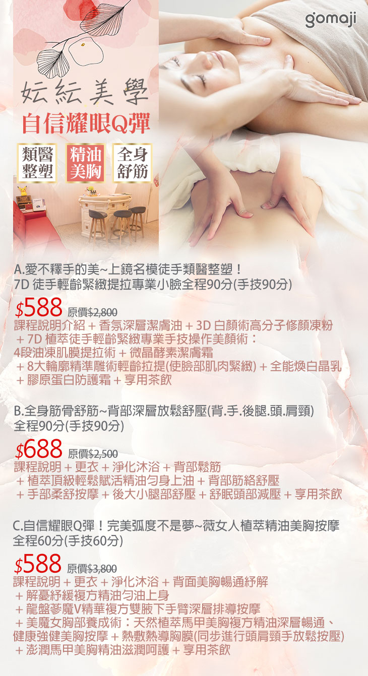 A.愛不釋手的美~上鏡名模徒手類醫整塑!7D 徒手輕齡緊緻提拉專業小臉全程90分(手技90分) / B.全身筋骨舒筋~背部深層放鬆舒壓(背.手.後腿.頭.肩頸)全程90分(手技90分) / C.自信耀眼Q彈!完美弧度不是夢~薇女人植萃精油美胸按摩全程60分(手技60分)