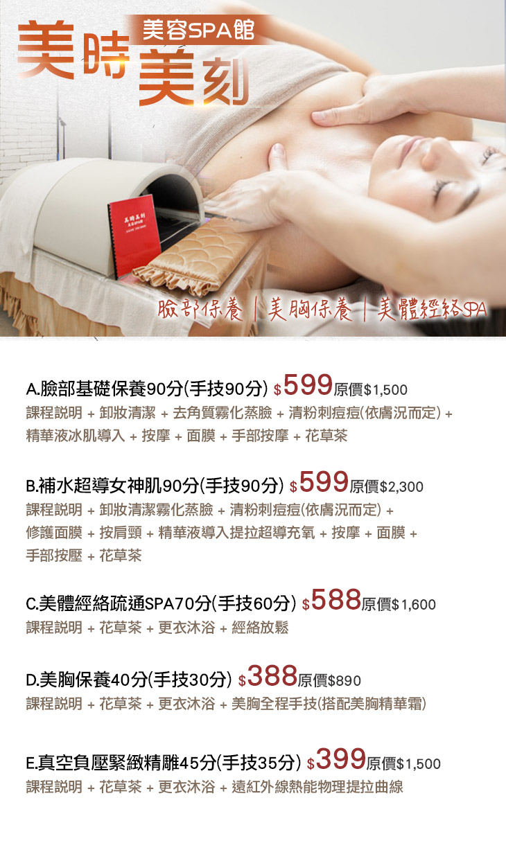 A.臉部基礎保養90分(手技90分) / B.補水超導女神肌90分(手技90分) / C.美體經絡疏通SPA70分(手技60分) / D.美胸保養40分(手技30分) / E.真空負壓緊緻精雕45分(手技35分)