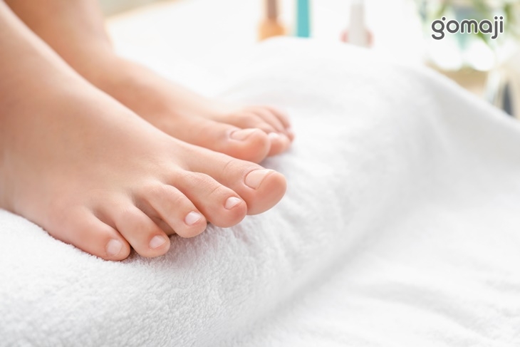 〈消毒 + 指甲修型 + 海鹽足浴 + 上緣甘皮處理 + 機器磨除兩側硬皮 + 杏仁嫩白去角質(至足腕) + 乳液保濕 + 指緣油護理〉