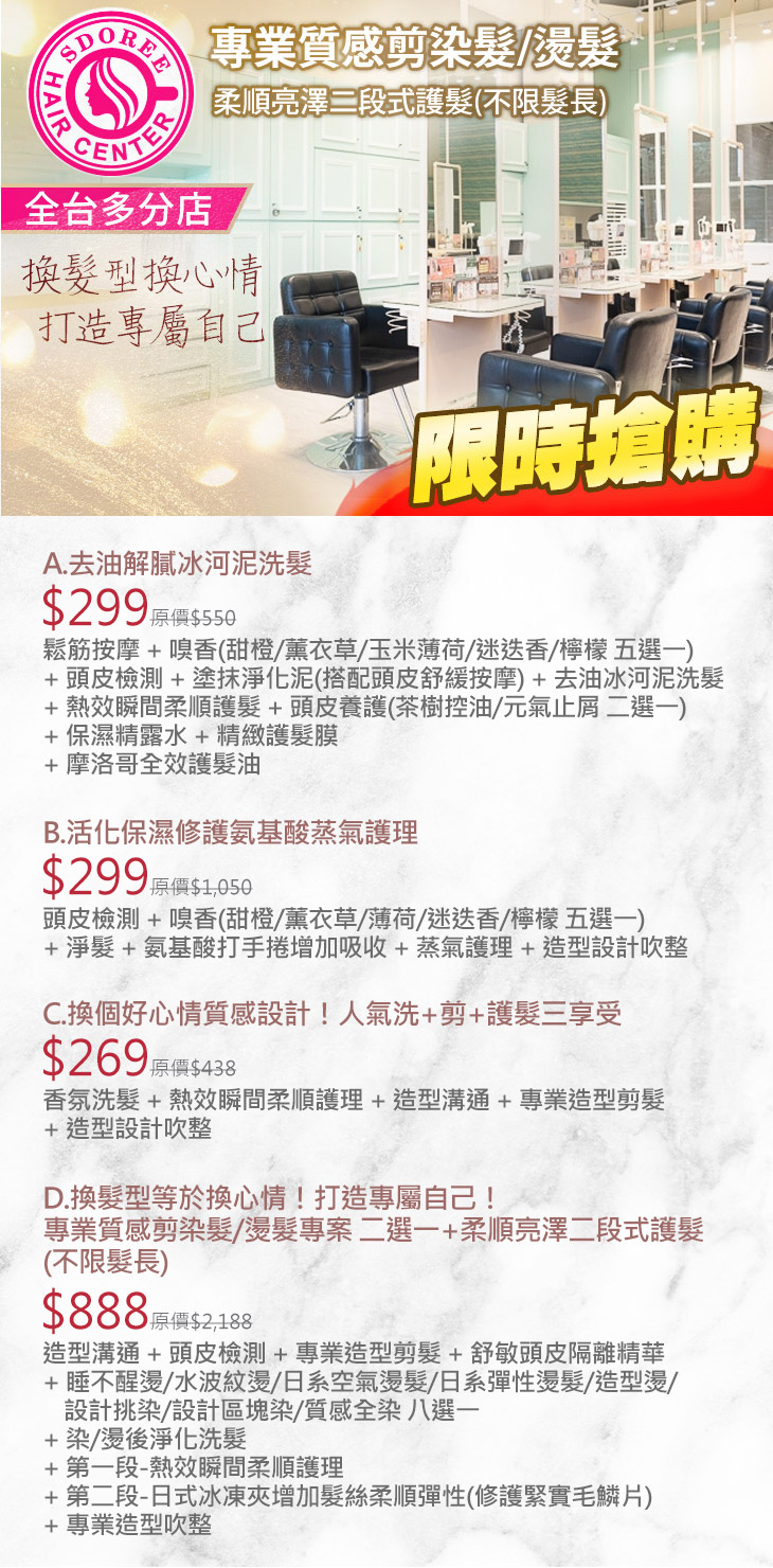 A.去油解膩冰河泥洗髮 / B.活化保濕修護氨基酸蒸氣護理 / C.換個好心情質感設計!人氣洗+剪+護髮三享受 / D.換髮型等於換心情!打造專屬自己!專業質感剪染髮/燙髮專案 二選一+柔順亮澤二段式護髮(不限髮長)