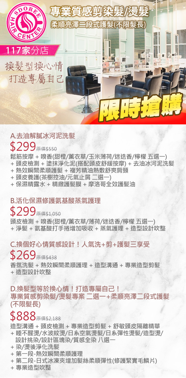 A.去油解膩冰河泥洗髮 / B.活化保濕修護氨基酸蒸氣護理 / C.換個好心情質感設計!人氣洗+剪+護髮三享受 / D.換髮型等於換心情!打造專屬自己!專業質感剪染髮/燙髮專案 二選一+柔順亮澤二段式護髮(不限髮長)