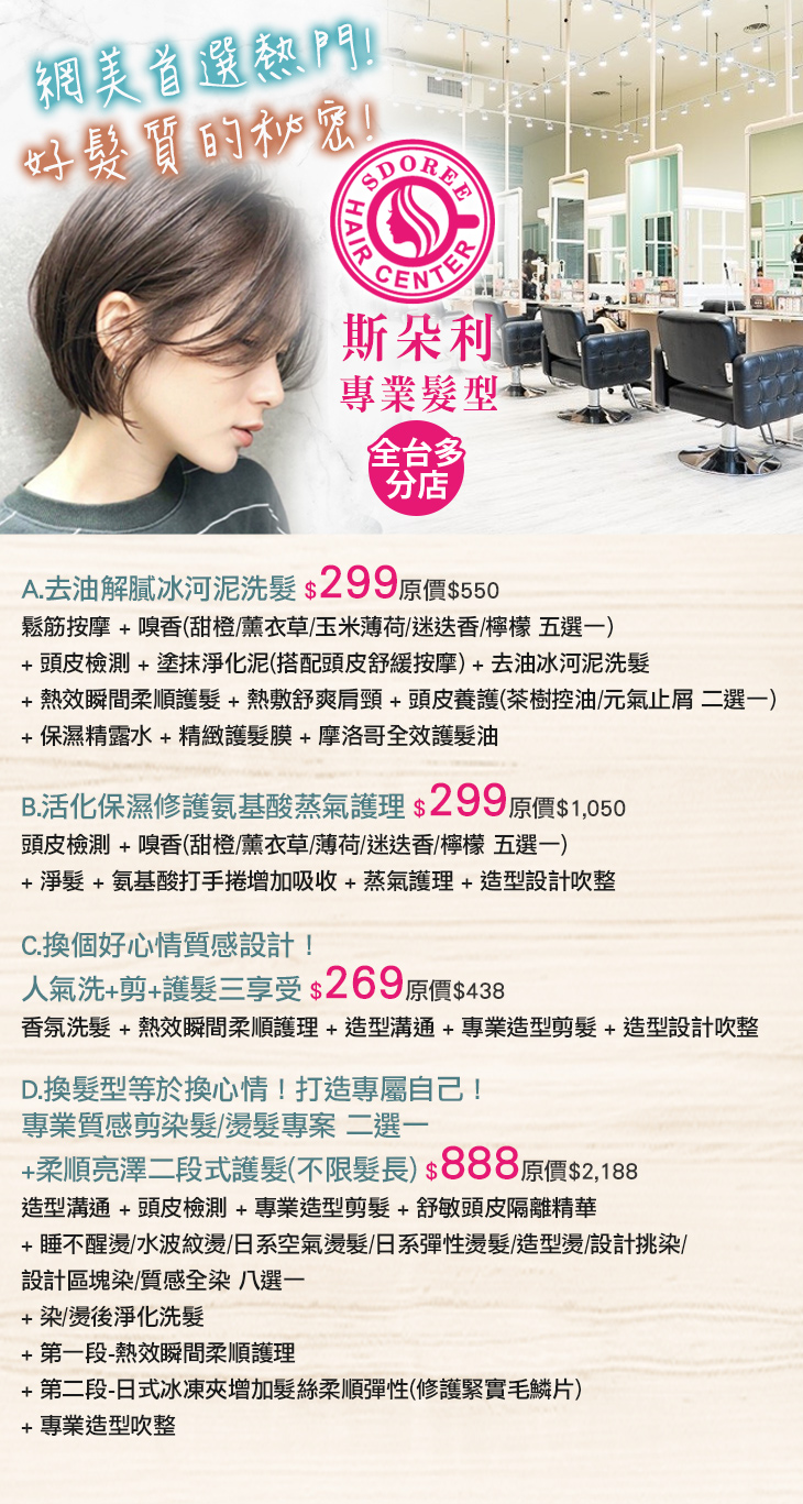A.去油解膩冰河泥洗髮 / B.活化保濕修護氨基酸蒸氣護理 / C.換個好心情質感設計!人氣洗+剪+護髮三享受 / D.換髮型等於換心情!打造專屬自己!專業質感剪染髮/燙髮專案 二選一+柔順亮澤二段式護髮(不限髮長)