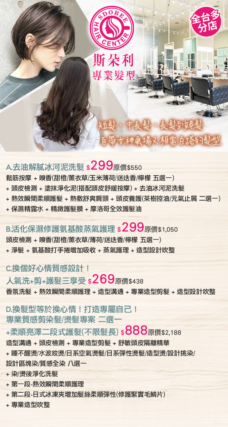 A.去油解膩冰河泥洗髮 / B.活化保濕修護氨基酸蒸氣護理 / C.換個好心情質感設計!人氣洗+剪+護髮三享受 / D.換髮型等於換心情!打造專屬自己!專業質感剪染髮/燙髮專案 二選一+柔順亮澤二段式護髮(不限髮長)