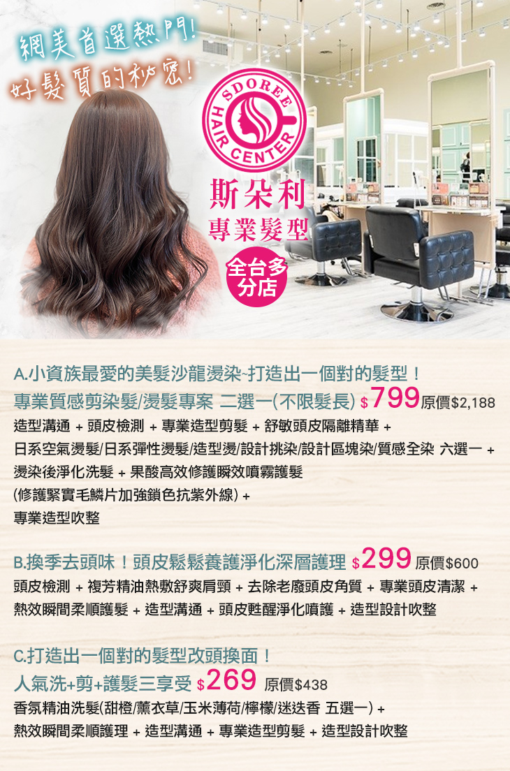 A.小資族最愛的美髮沙龍燙染~打造出一個對的髮型!專業質感剪染髮/燙髮專案 二選一(不限髮長) / B.換季去頭味!頭皮鬆鬆養護淨化深層護理 / C.打造出一個對的髮型改頭換面!人氣洗+剪+護髮三享受