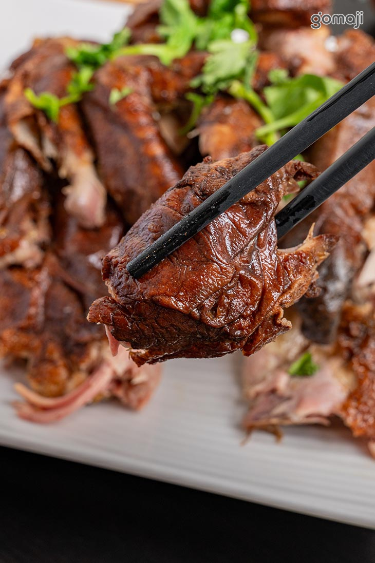 這道秘制燒雞,靈感來自「德州扒雞」與「符離集燒雞」選用1.1公斤的童子雞,先鹽醃去腥冒、再刷上麥芽糖風乾、炸到皮是焦糖色,最後泡進使用20種中藥材熬成的老滷汁裡慢火慢煮,入味到底,就像傳統中式燒雞一樣,涼的最香!鹹香鮮嫩、入口即化,脫骨的那種嫩,保證一口接一口停不下來。