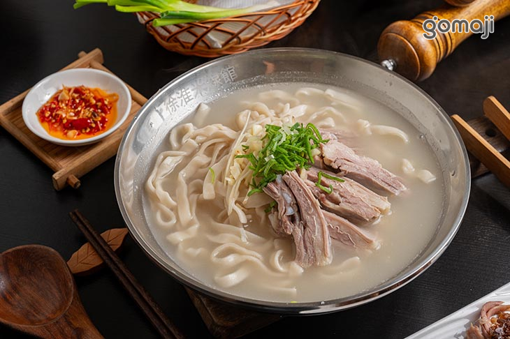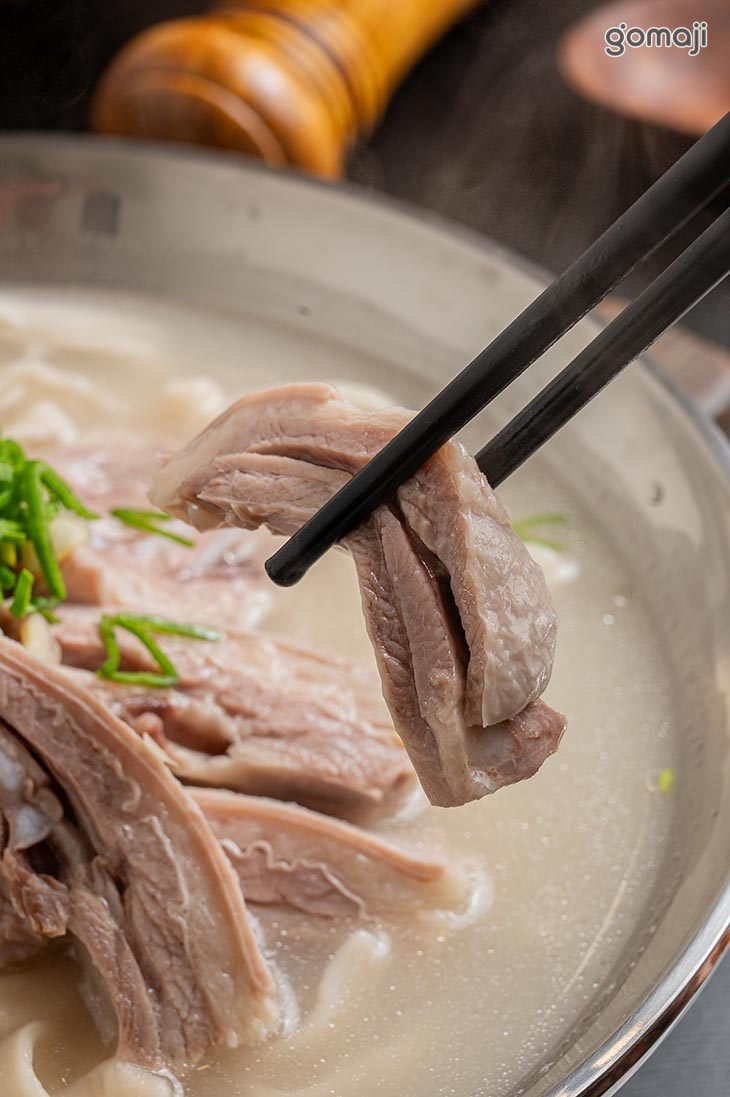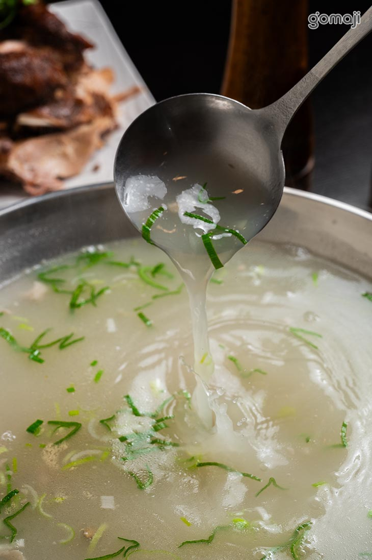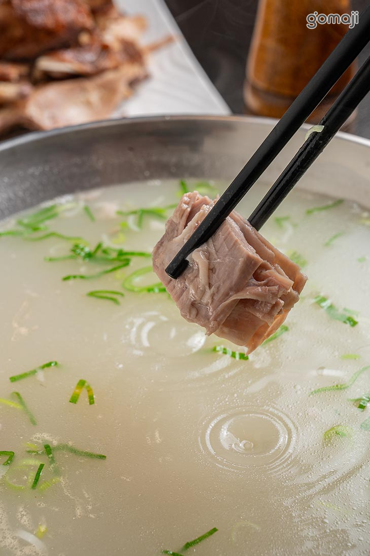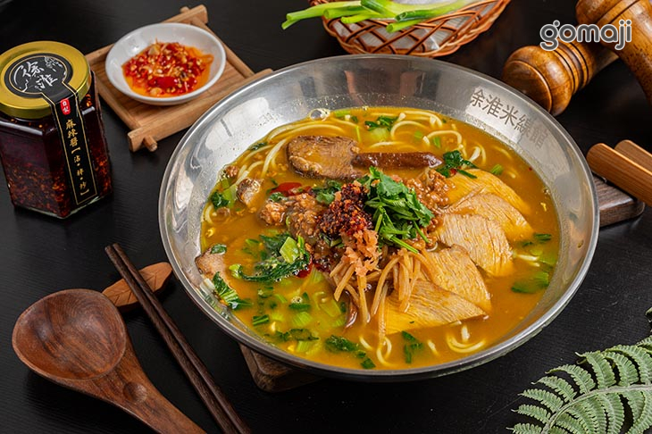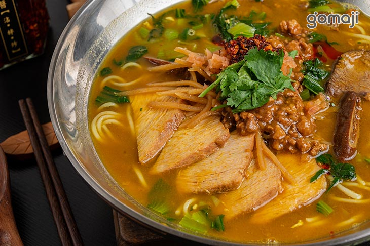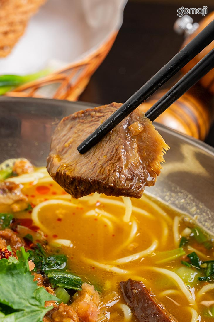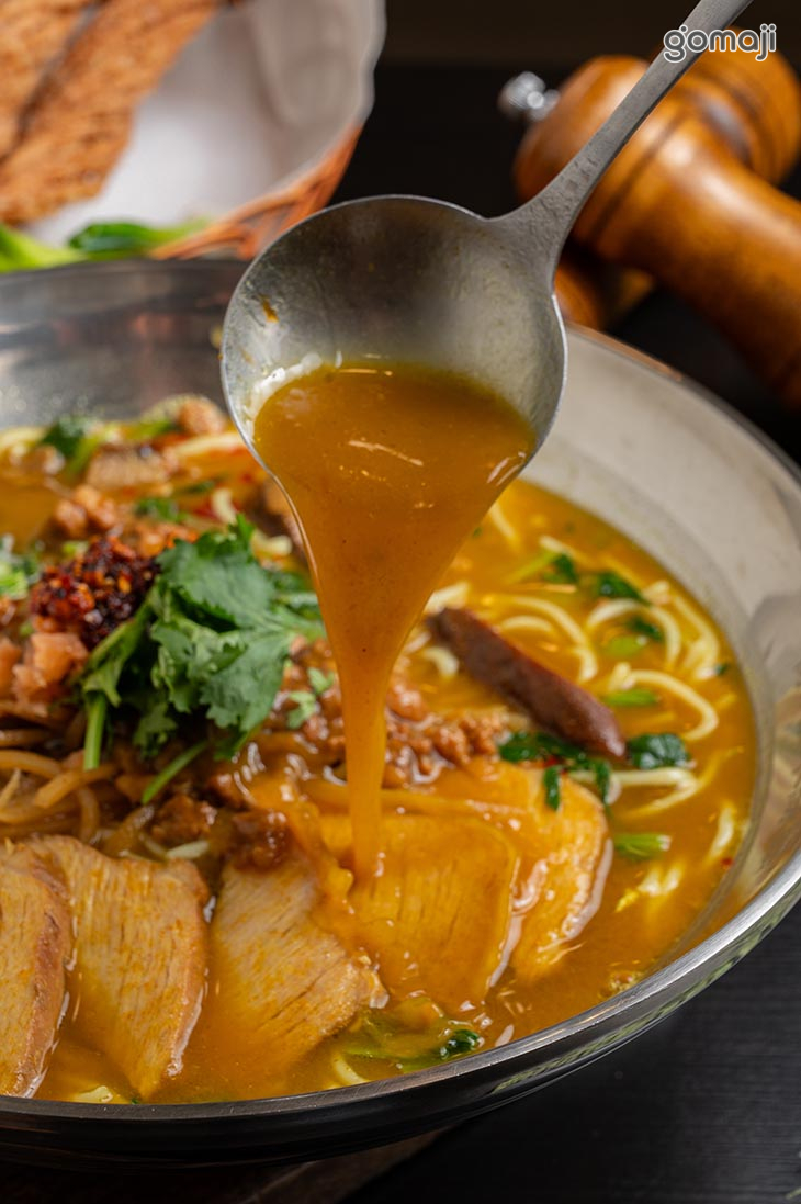 選用羊腩排部位,經長時間溫柔燉煮,手工去骨後切塊,肉質軟嫩、帶有筋香;湯頭則以羊肋排與羊骨慢火熬製,是濃縮時間與火候的精華,Q彈拉麵搭配濃醇羊湯與塊狀羊肉,吃得到筋香、肉香,層次豐富、回味無窮。