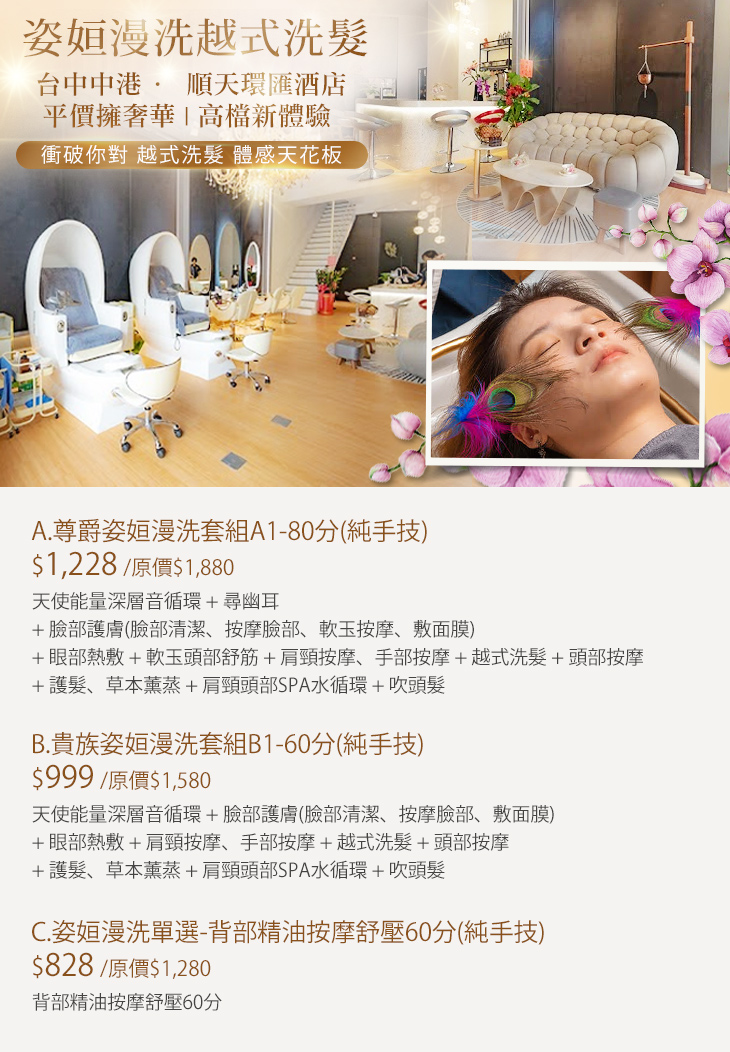 A.尊爵姿姮漫洗套組A1-80分(純手技) / B.貴族姿姮漫洗套組B1-60分(純手技) / C.姿姮漫洗單選-背部精油按摩舒壓60分(純手技)