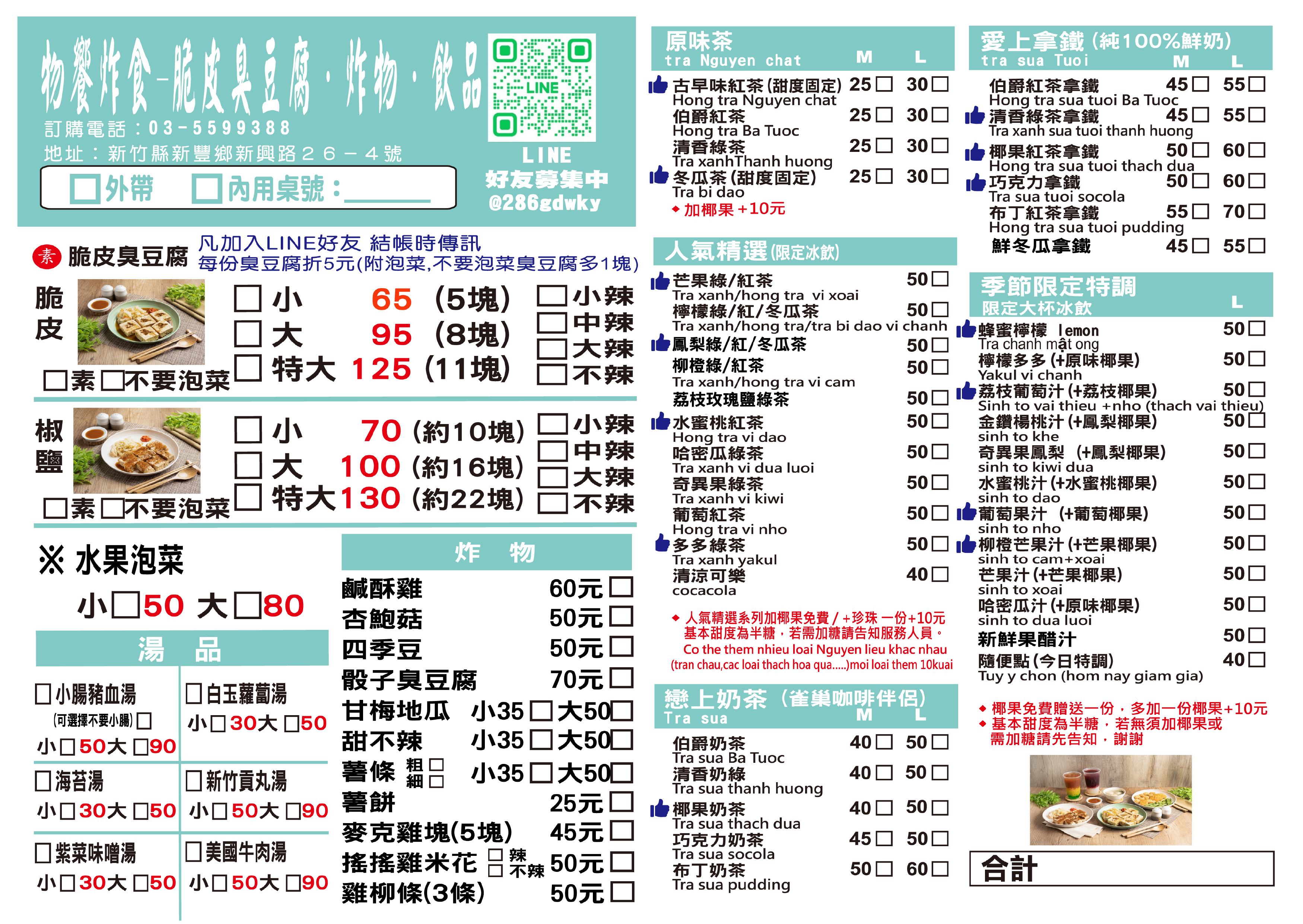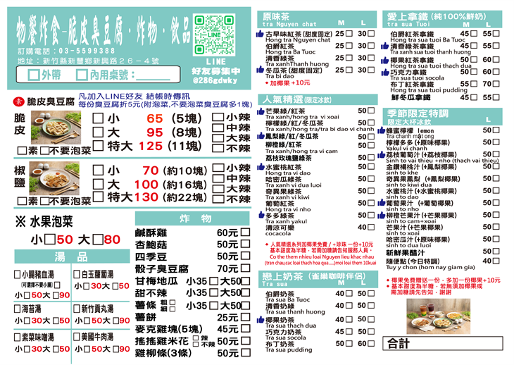 你以為只賣美味的臭豆腐嗎?No~現在升級連炸物、飲料都有,滿足愛吃美食好料的你!
