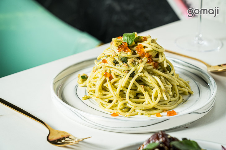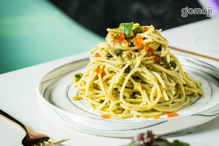 佐以新鮮羅勒精心調理烹煮而成的青醬,色澤飽滿、香氣誘人,在眾多食材的和諧搭配下完美獻上!彈牙咕溜的條麵完整吸附了醬汁的濃郁精華,相佐優質肥美的魚卵為整體增添了一抹耐人尋味的鮮香韻味,保證讓您吃得心滿意足、意猶未盡!