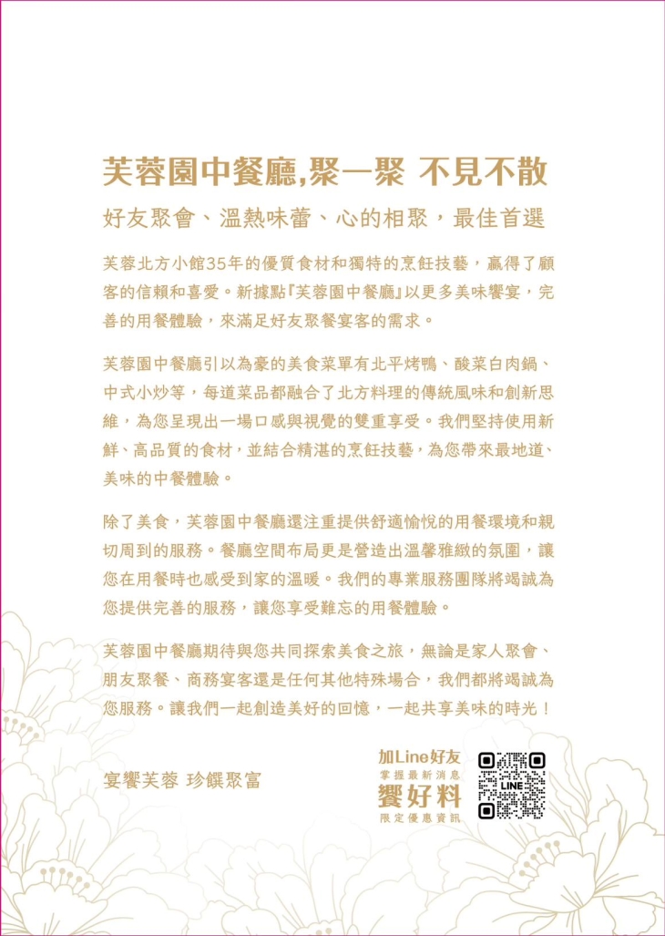 隱身在信義路巷弄中的芙蓉園中餐廳,由資深老師傅坐鎮掌杓,延續老店一貫的用心與堅持。店內空間寬敞明亮,圓桌設計最適合親朋好友圍坐聊天,氛圍溫馨卻不失氣派,無論小型聚會或大型宴席都很好安排。價位親民、選擇多元,是家庭聚餐、朋友相約的熱門場地。從捷運信義安和站步行約三分鐘即可抵達,交通方便不麻煩。芙蓉園中餐廳不只是一家老字號,更像是大家相聚的客廳,讓人可以在舒適的環境裡放慢步調,與重要的人好好說說話,細細品味那份屬於團聚的溫度與人情味。