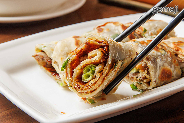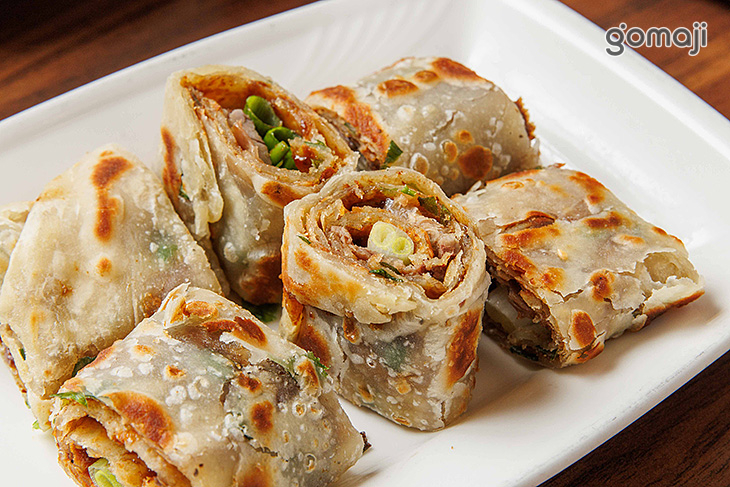 「牛肉捲餅」餅皮微酥,內餡的牛肉軟嫩帶汁,還有蔥絲和蔥花,配上鹹甜交錯的醬料,讓整個捲餅層次更加豐富,吃過就會立刻愛上。