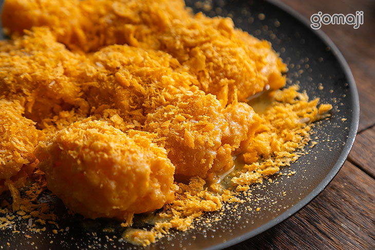 特調的金沙醬畫龍點睛,不管是大人小孩都喜歡!金黃酥脆的外皮包裹著新鮮蝦肉,口感外脆內Q、滋味鹹香不膩,主廚以精湛手藝掌握最佳風味,吃下一口,伴隨著金沙醬的溫潤尾韻綻放於舌尖,還有誰能抵擋它的美味攻勢!