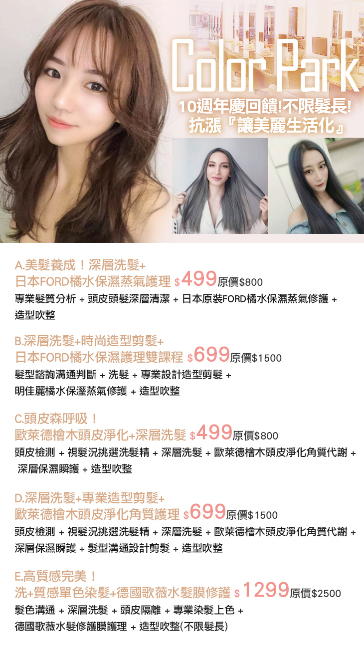 讓美麗生活化!【Color Park】將您的美實體化,打造您夢想中的髮型,帶領您追求時尚、潮流的最高殿堂~專業設計師團隊,講究服務與技術,將透過強力的美髮技巧及對美的感知與概念,在滿足您的美髮需求同時,完成適合您的造型!更體貼的是,所有的髮型在設計時都主張『您回家後也能輕鬆整理』的概念,讓您回去後也能輕鬆打理自己,隨時擁有完美造型!無疑是您造型自己最強大的後盾!