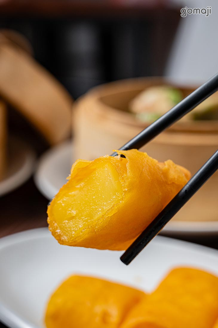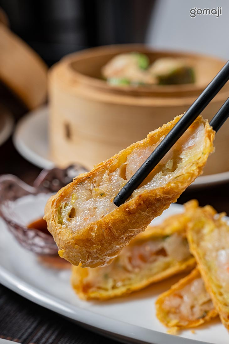 鮮蝦腐皮卷外層是金黃酥脆的腐皮,經過油炸後散發出誘人的香氣,咬下一口能聽到輕脆的聲響。內餡包裹著鮮嫩的蝦肉,搭配少許蔬菜增添清爽口感,讓整體味道更加均衡。蝦肉飽滿彈牙,搭配腐皮的酥脆,形成一種外脆內嫩的完美對比,再蘸上一點醬,更是讓味道升級。這道點心香氣濃郁又不膩口,是一道讓人一吃就愛上的美味!
