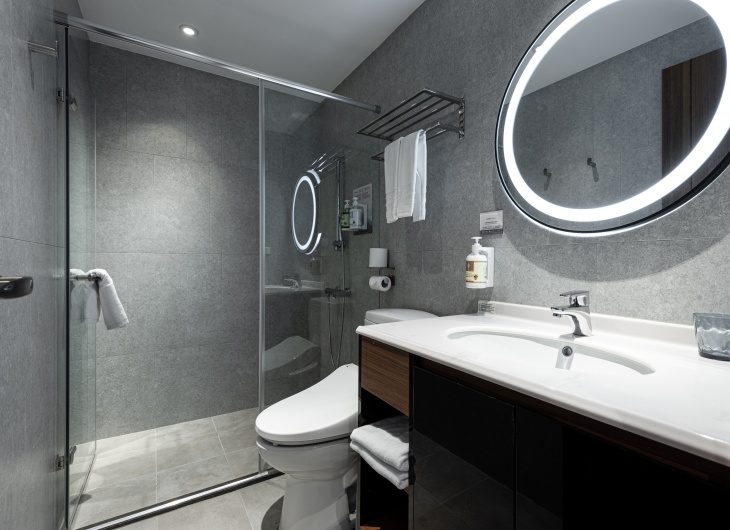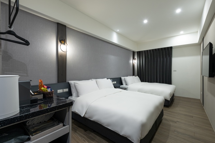高級四人房以沉穩灰色調為基底,搭配柔和燈光與木質地板,打造出寧靜、舒適又有質感的共享空間。兩張寬敞雙人床讓每位旅人都能擁有專屬的休息角落,房內配置齊全,暖心又便利,不論是家人出遊、好友結伴,或是小型團體旅行,都非常合適~