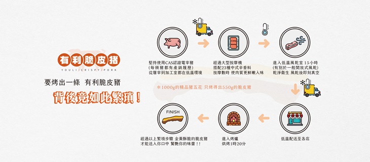 1000g的精品豬,只烤得出550g的脆皮豬,在烤箱內烘烤爆皮,外酥內嫩,好吃到不像話。