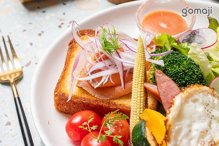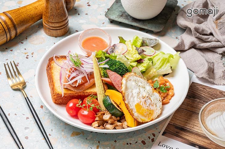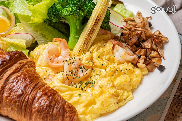 以精準掌握火侯,將金黃蛋液烹製成如絲綢般細滑的歐姆蛋,搭配鮮甜Q彈的海味蝦仁,交織出溫潤且清爽的絕妙口感。盤中襯以酥脆現烤可頌、繽紛生菜與香煎蕈菇,構築出和諧的膳食平衡。這份色彩繽紛且飽含溫度的手作料理,最適合與好友共享,讓家一般的療癒氣息悠然散發於午後時光。