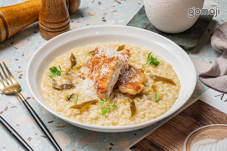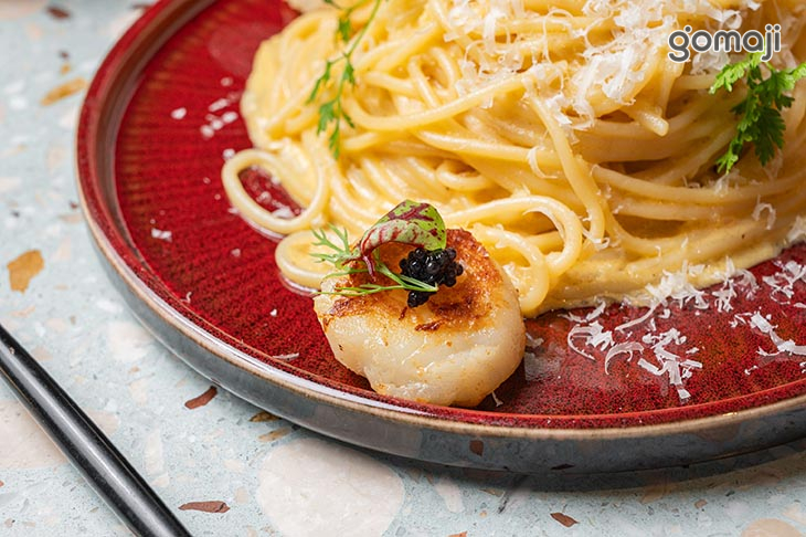 創意將中式金沙鹹香揉入西式奶油醬,讓濃醇的金黃醬液完美吸附於 Q 彈麵條,譜出令人驚艷的在地義式韻味。表面煎至焦香的厚實干貝鮮甜多汁,佐以魚子醬與現磨起司粉,瞬間極大化了整體的奢華感。這份極致奢華的視覺饗宴,不僅滿足了饕客對美學的偏執,更是一場在味覺巔峰上恣意跳動的華麗冒險。