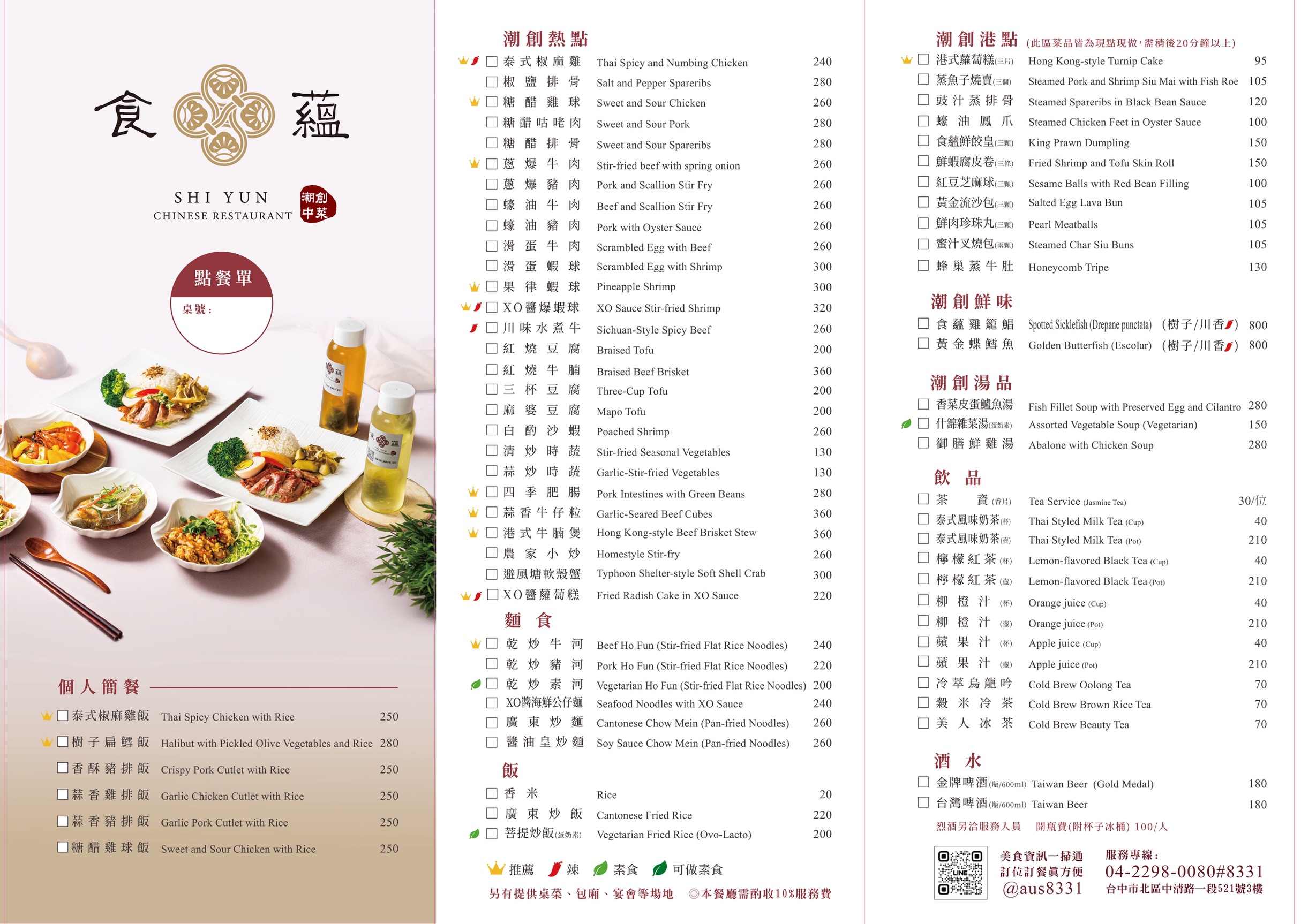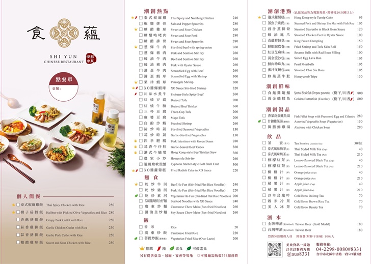 融合廣東菜的鍋氣、川菜的麻香與台菜的人情味,食蘊打造出獨具風格的創新中菜。招牌菜包含鍋氣十足的干炒牛河、蛋香四溢的廣東炒飯,以及脆彈鮮香的XO醬爆炒蝦球,每一道都深受饕客喜愛。