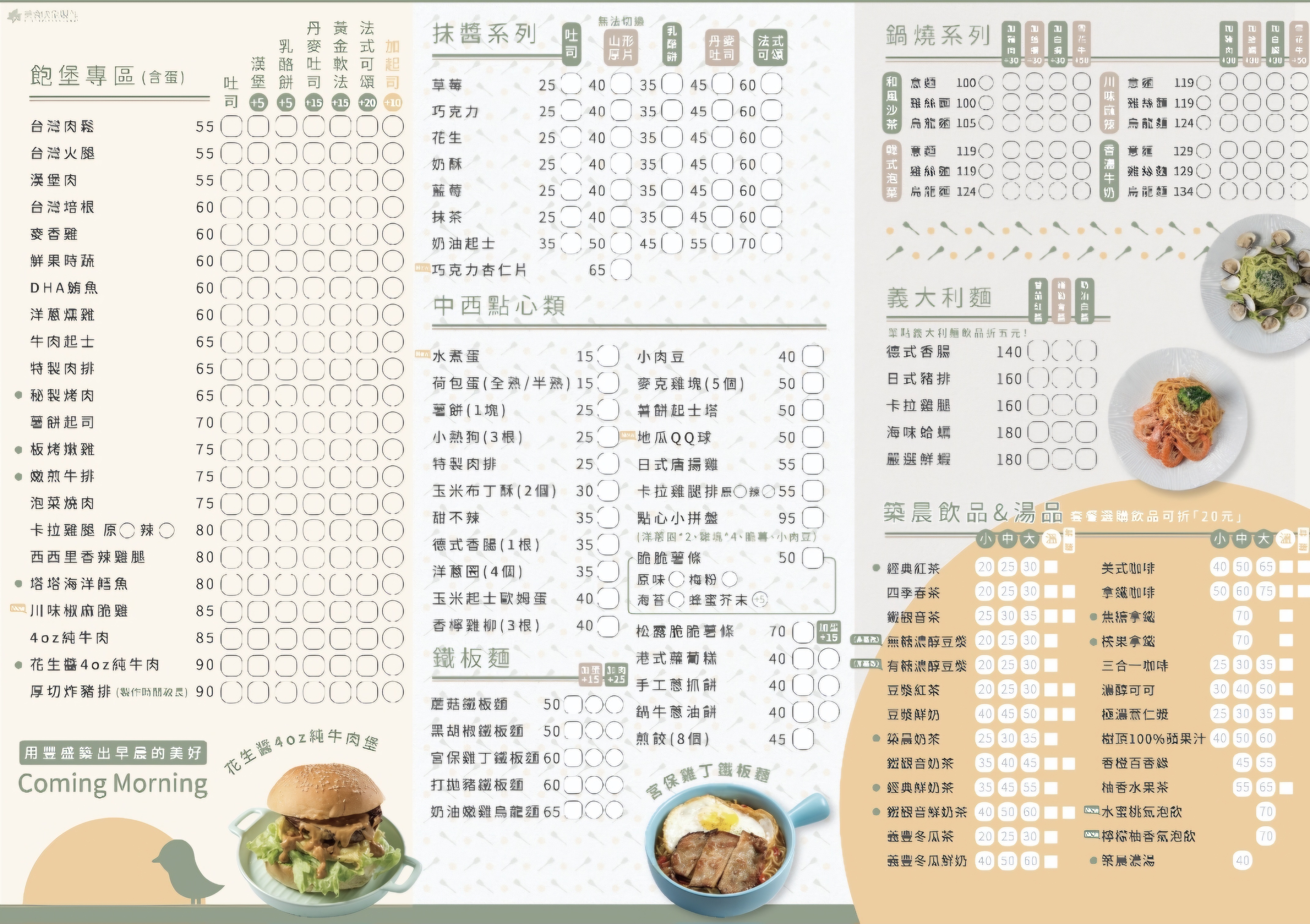 帶給你一整天的美好心情!走入店內,簡約清新的環境讓人感到輕鬆舒適,店家提供豐富多樣的早午餐點選擇,讓每位來訪的顧客都能感受到滿滿的朝氣,從舒適的座椅到寧靜的用餐氛圍,每一處細節都精心設計。想要享受美食與輕鬆的氛圍嗎?讓【築晨早午餐】為你的一天注入活力!