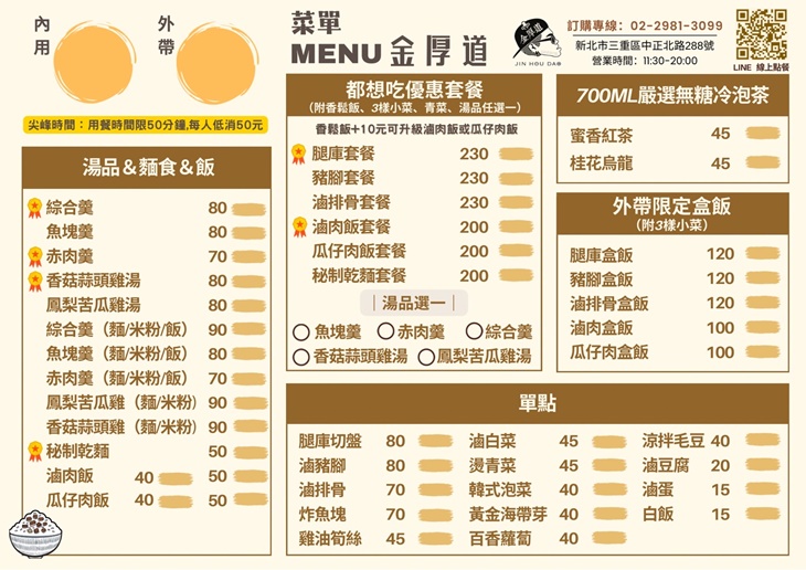 金厚道是一家主打台式經典美味的餐廳,展現了純正的台灣家鄉味。店內的滷肉飯選用優質豬肉,經過長時間燉煮,滷汁鹹香濃郁、肉質細嫩,完美搭配香Q白飯,帶來令人懷念的味覺體驗。羹湯類如魚塊羹、赤肉羹等,湯底鮮甜濃稠,內餡豐富,入口滑順,令人回味無窮。而燉湯部分則注重養生與口感,選用新鮮食材熬煮出香氣濃郁、營養豐富的湯品。整體店內氛圍溫馨質樸,是想要體驗地道台式風味的絕佳選擇。