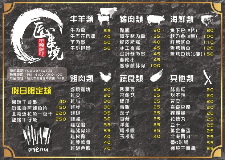 營業時間:週二至週日 18:00~01:00 每週一公休
